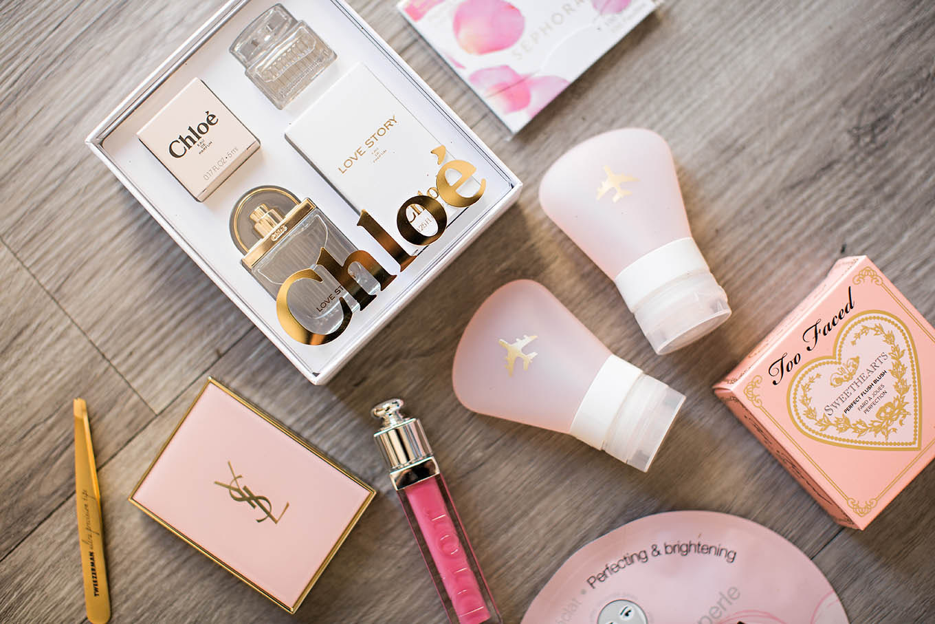 DRY SHAMPOO |Β VOLUMIZING HAIR POWDERΒ |Β PINK TRAVEL SHAMPOO GIFT SET | Β PRIMER WITH SPFΒ | CHLOE PERFUME GIFT SET | ROSE BLOTTING PAPERSΒ | LASH CURLER | Β BLUR PERFECTER | MAKEUP REMOVER | BLUSH TRIO (SHADE: PEACH BEACH) | | NAIL POLISHΒ (SHADE: IVORY NUDE) | TWEEZERSΒ | LIP STAIN STICK (SHADE: MELTED SUGAR) |Β NUDE LIP GLOSSΒ (SHADE: NUDE) | MATTE EYE PALETTEΒ | FACE MASK