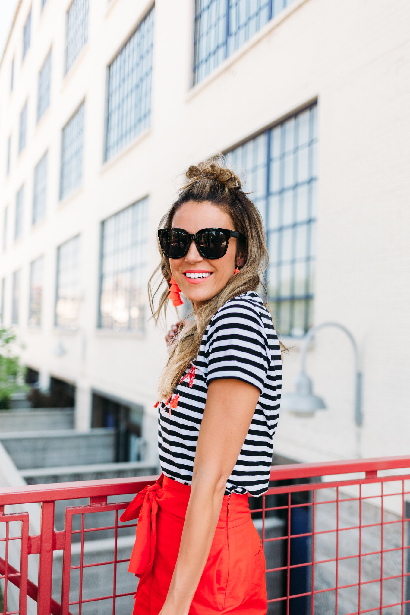 DETAILS: STRIPED GRAPHIC TEE (UNDER $100) | RED BOW PANTS (FITS TRUE TO SIZE – ALSO COMES IN BLACK) | POM POM HEELED SANDALS