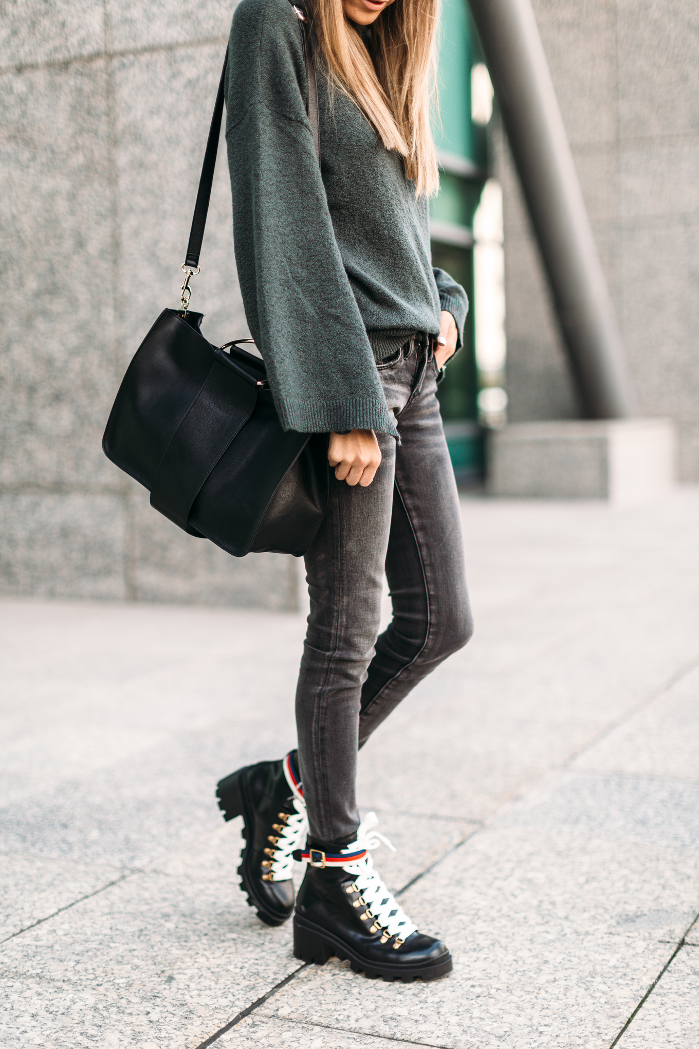 DETAILS: BELL SLEEVE SWEATERΒ (UNDER $100) | GREY DENIM (UNDER $100) | BLACK BERETΒ (UNDER $50) | BLACK COMBAT BOOTSΒ | BLACK CROSSBODYΒ (UNDER $50)Β | PINK PEARL SUNGLASSES