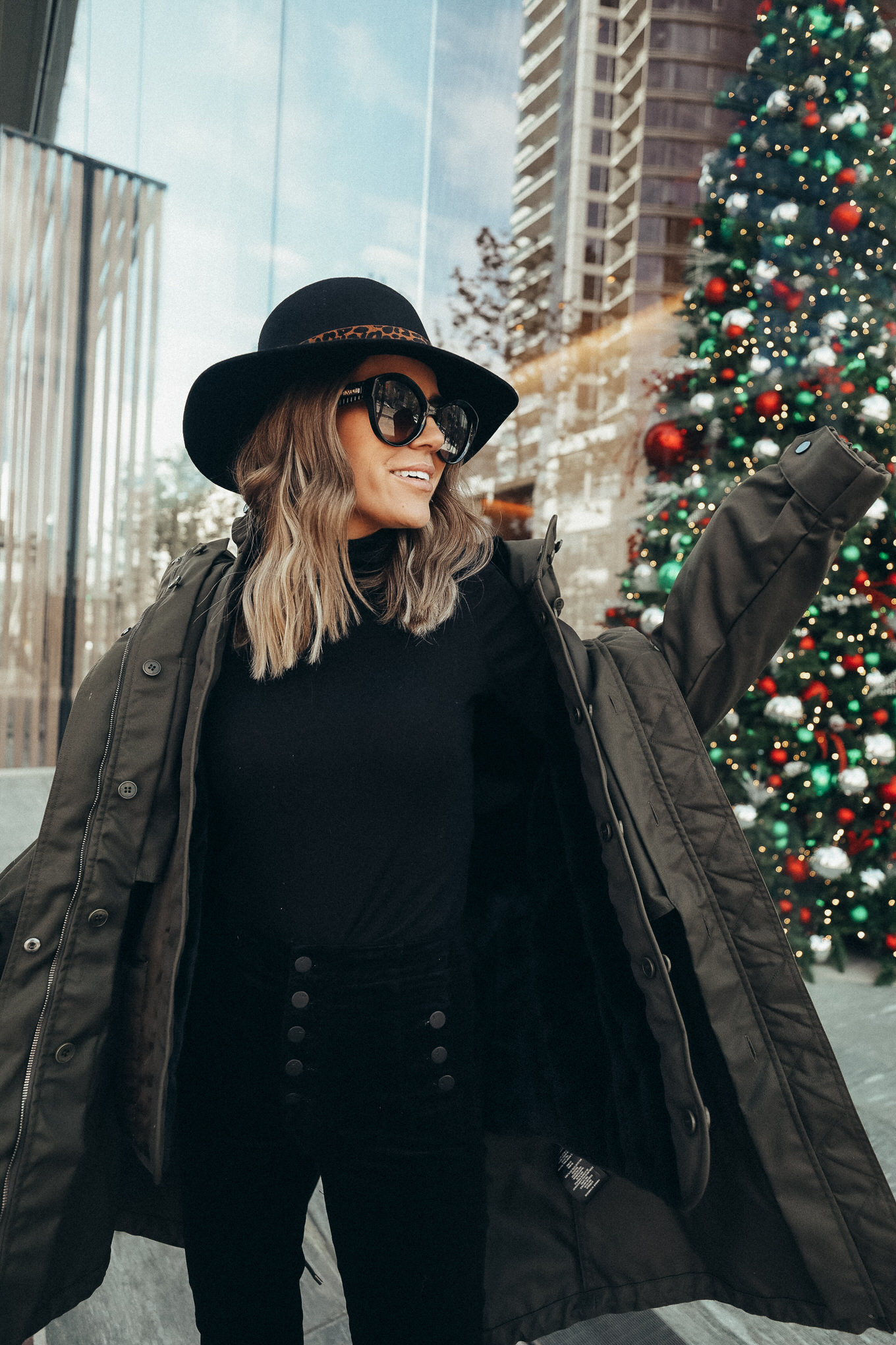 Coats are always one of my very favorite things to buy. I swear you can never have too many! I am obsessed with this new green coat from Saks because its two coats in one. It can be worn without the longer part when its not quite as cold out, and add the longer part over it when it’s freezing! I love the look of both! For running errands with the family I paired my new coat with easy all black basics. You’ve seen me wear this turtleneck many times before – it’s such a great staple to have in your closet and easy to layer with everything! Loving these new velvet black skinnies and of course the pop of leopard in my shoes and hat. You could easily swap out the heels for a pair of booties for a more casual look – I recently got these and love them!