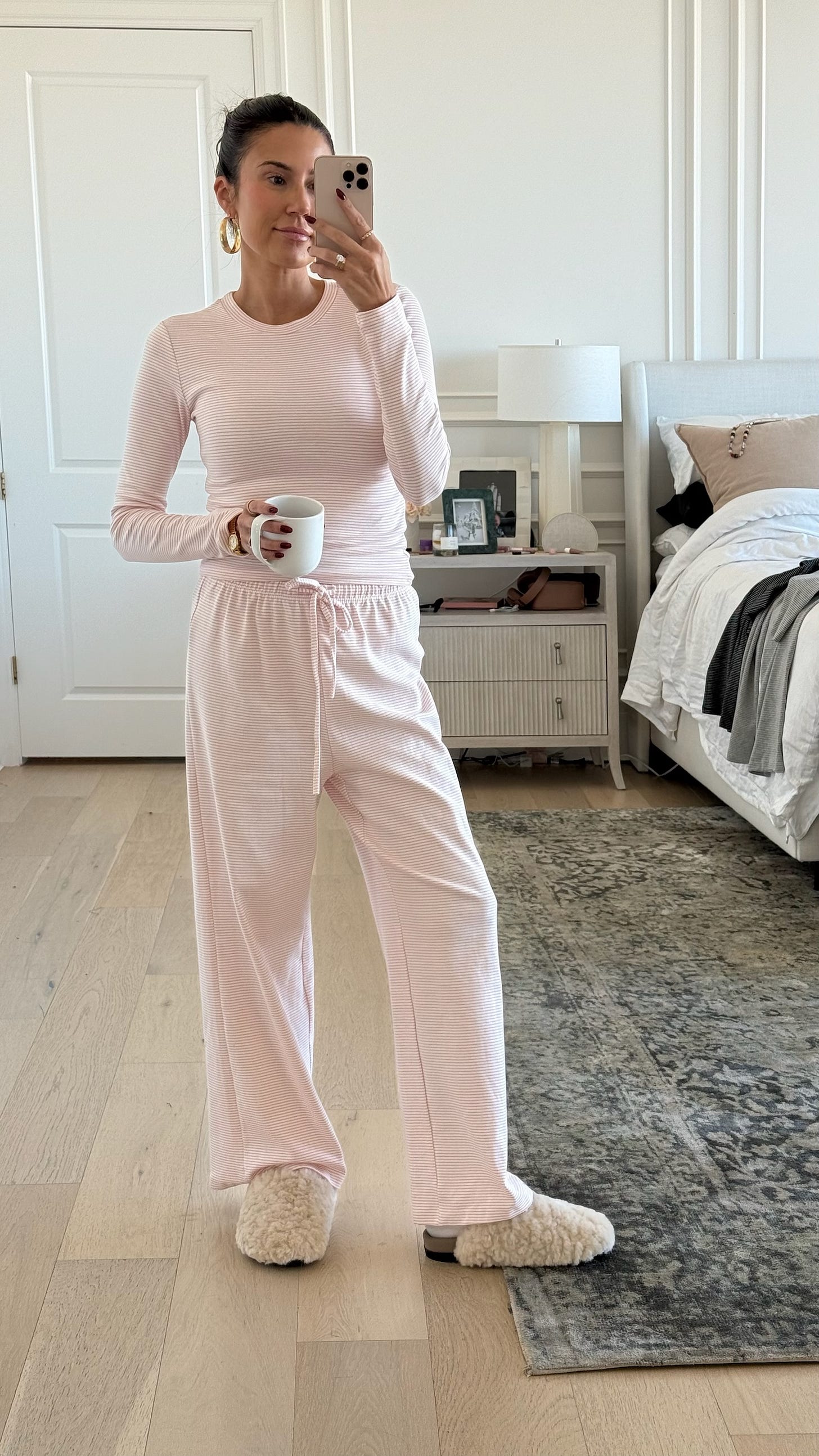 This matching striped lounge set has been a recent best seller for good reason – its so comfy and under $50! Comes in a few colors, I have and love the light gray …but I am loving this pink color for Valentines season! Wearing size small. My slippers are so cozy & from amazon too!
